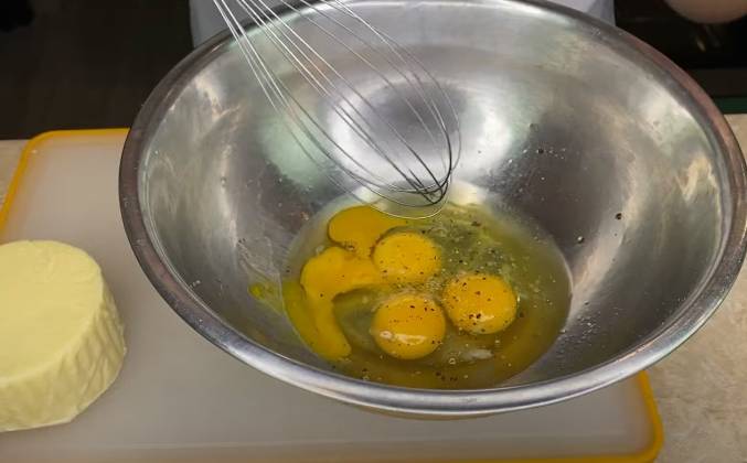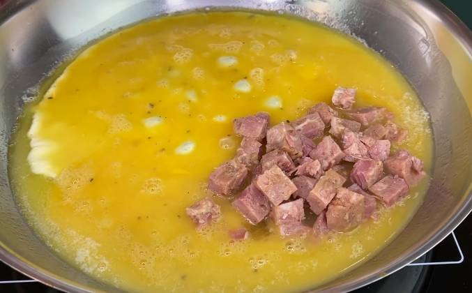 2. Один томат разрежем на такие ломтики и разрежем вот таким крупным кубиком. Выбирайте сочные помидоры. Эта ветчина очень вкусная и качественная. Здесь крупные кусочки мяса. Ветчины нам понадобится 340 г. Очень хорошие консервы! Рекомендую! Продается во всех супермаркетах украины. Вы можете заказать ветчину через официальный сайт. Ссылка в описании хранится ветчина 2 года без холодильника разогреваем сковородку на медленном огне, добавим грамм двадцать растительного масла, грамм 40 сливочного масла и хорошо смазываем борта такая запеканка получится пышной. Такую запеканку можно готовить на ужин. Как только масло хорошо разогрето, заливаем яичную смесь. Залили яичную смесь чуть-чуть подождали. И делим визуально на 4 порции такую ветчину я беру в дальние поездки делаю бутерброды.