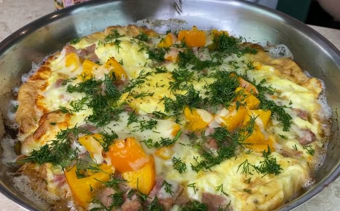 3. Сверху выкладываем помидор, теперь сыр сверху добавляем еще черный перец. Теперь ставим омлет в духовку. Запекаем 4-5 минуты при температуре 220 градусов. Возьмем такой хороший пучок зелени. Вы можете использовать на свое усмотрение любую зелень я использую укроп. Можно добавлять тимьян, розмарин - вообще не ограничивайте себя в выборе. Любите себя и любите то что вы делаете. Спустя 4 минуты наша запеканка готова! Вообще это идеальный завтрак! Присыпем свежей зеленью. Аромат просто космический! Пришло время пробовать. Благодаря нашей ветчине одна порция такой фриттаты стоит 1 доллар. Просто восхитительно ветчина после термической обработки просто космическая!Видео рецепт ютуб ниже 👇