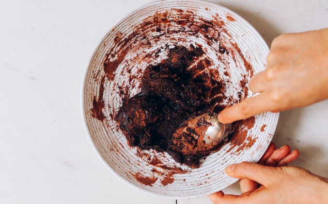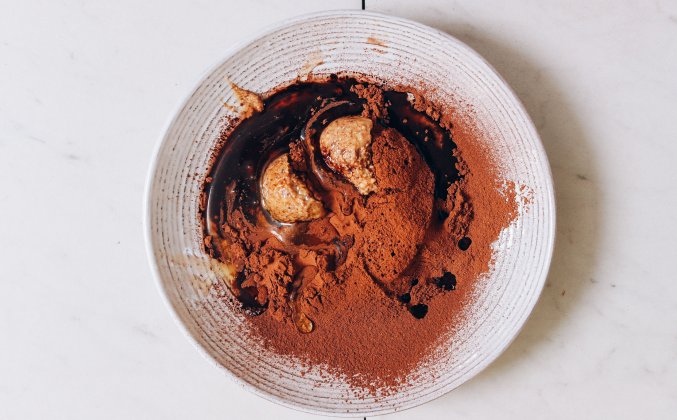 2. Замешиваем тесто. В этот момент вы можете сформировать его в шарики, выкопав примерно 1 столовую ложку и скатавв шарики (затем посыпать какао-порошком, чтобы предотвратить прилипание к тарелке). Или вы можете сформировать его в виде полоски одним из двух способов: 1) Положите смесь на одну сторону листа пергаментной бумаги, сложите пергаментную бумагу и используйте скалку, чтобы раскатать плитку шоколада в плоскую полосу из теста (~ 0,25 -0,5 см толщиной), затем разверните пергаментную бумагу и используйте шпатель или аналогичный инструмент, чтобы сформировать квадрат или прямоугольник. Если вы делаете двойную партию, вы можете выложить небольшую форму для выпечки с пергаментной бумагой и вдавить смесь, затем накрыть еще одним слоем пергаментной бумаги и использовать предмет с плоским дном, чтобы вдавить в смесь плоскую полосу.