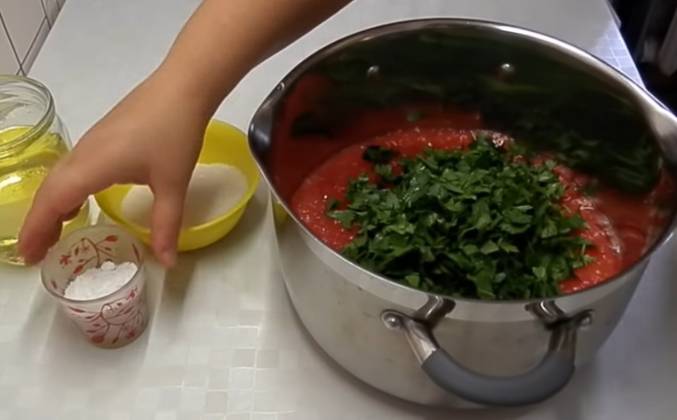 3. Все хорошо перемешиваем и доводим до кипения. И вот когда все хорошо и равномерно закипело, делаем огонь меньше, чтобы кипело по тихоньку и периодически перемешивая, варим 35 минут. За 5 минут до окончания варки добавляем 50мл 9% уксуса, перемешиваем и довариваем. Пока варился салат я простерилизовала банки. Сделала я это в микроволновке: налила на дно немного воды и поставила на пару минут при полной мощности. Вы же можете сделать как Вам удобно. Ну а крышки я просто прокипятила в кипятке.