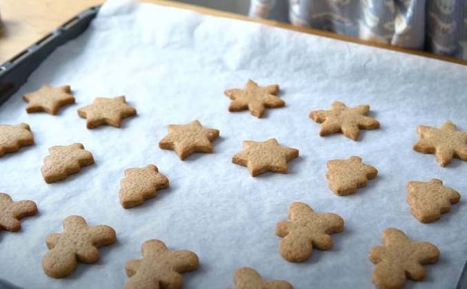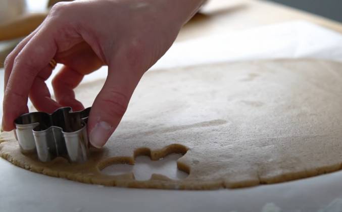2. Так с ним будет легко работать, печенье будет легко вырезаться и не будет липнуть. Как вариант, можно ускорить процесс и убрать его в морозилку на 15 минут. Также тесто можно заморозить до нужного времени. Лист пергамента слегка присыпать мукой и тонко раскатать охлажденное тесто, примерно 3-4 мм толщиной. Для удобства накройте его пленкой, чтобы не добавлять лишней муки. С помощью формочек вырезать печенье и аккуратно переложить их на противень, застеленный бумагой для выпечки на расстоянии друг от друга. Выпекать в разогретой до 180 градусов духовке от 7 до 12 минут в зависимости от толщины печенья и духовки, но важно его не передержать!