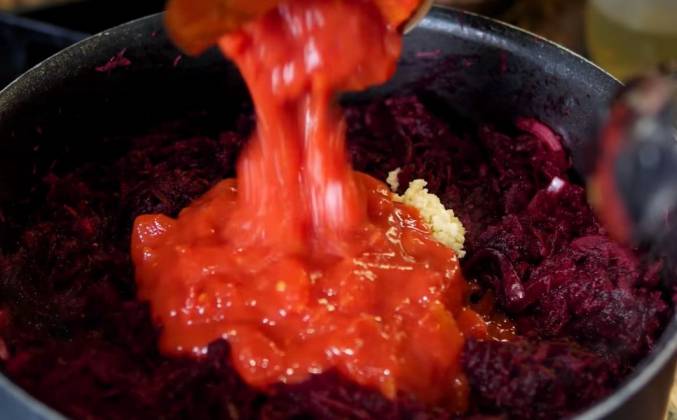 3. Хорошенько все перемешиваем и жарим вместе еще минут 5. Кстати, сейчас уже можно добавить соль и перец. Через 5 минут сюда я выдавливаю чеснок и закидываю баночку рубленых томатов. Хорошенько перемешиваем и жарим вместе еще минут 5-10. Через 10 минут выключаем огонь, и дадим блюду немного остыть. Когда блюдо подостынет, сюда можно замешать немного оливкового масла, буквально 5-10 мл. Масло здесь будет служить связующим звеном между всеми ингредиентами. Так как блюдо уже не горячее, никакой опасности разложения масла нет. Свекольная икра готова!Видео рецепт ютуб ниже 👇