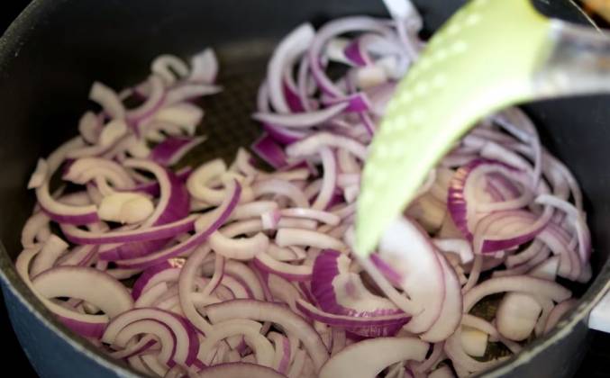 2. Да уж, натирать сырую свеклу - это не самая простая задача, но с ней мы наконец-то управились. Лук мы чистим и нарезаем полукольцами. Разогреваем сковородку, и сейчас нам необходимо обжарить лук. Лук я обжариваю на небольшом огне и без масла. И сейчас объясню почему. Я жарю без масла не потому, что я боюсь каких-то лишних жиров в рецепте. Масло мы здесь будем использовать, но позже. А потому что при термообработке масло зачастую теряет свои полезные свойства, а иногда даже становится вредным. И это касается практически всех типов масел. Для каких-то в большей степени, для каких-то в меньшей. Наиболее безопасным считается кокосовое масло. Если вы так же, как и я, решите жарить все без масла, но к вашей сковородке пища прилипает, то можно подлить немного воды. Лук в сумме я обжаривал минут 7, и сейчас к нему отправляется свекла.