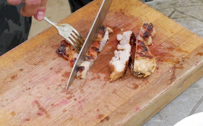6. Ну и напоследок я покажу блюдо, которое можно приготовить утром из остатков вчерашнего шашлыка. Берём мяско, нарезаем его на небольшие кусочки. На фольгу выкладываем лист лаваша, посыпаем тертым сыром, выкладываем кусочки мяса. Ну, мяса можно взять, конечно, и побольше. Накрываем всё это дело вторым лавашом и заворачиваем в фольгу. Отправляем все это дело на угли минут на 5. Получилась вот такая вот своеобразная кесадилья. Это блюдо идеально зайдет на завтрак. Мы сегодня приготовили массу всего интересного, начиная от закусок и заканчивая десертом.