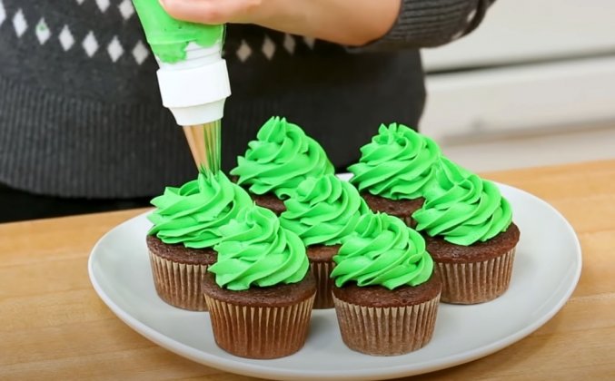 2.  Переложить сливочный крем в мешочек со звездочкой. На каждый кекс выложите начинку, чтобы сформировать маленькую рождественскую елку.Видео рецепт ютуб ниже 👇