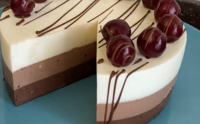3.  Отправляем в холодильник. В оставшую смесь добавляем ещё 10 гр какао, заливаем третий шоколадный слой поверх торта и в холод . ☝️ ВАЖНО! Чтобы масса была всегда жидкой нужно подогревать ее в микроволновке или на водяной бане. Но нельзя чтобы мусс был горячим , иначе не ляжет слоем на предыдущий а привалится в нем !!! Торт готов. Украшаем по желанию .