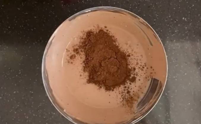 2. Затем собираем торт в силиконовой форме, либо в разъемной форме застелив его бардюрной лентой. Массу визуально делим на 3 части . Первую часть заливаем в форму и отравляем в холод на 10-20мин. Тем временем в отставшую смесь добавляем 10гр какао. Перешиваем и заливаем половину массы на белый слой тортика .