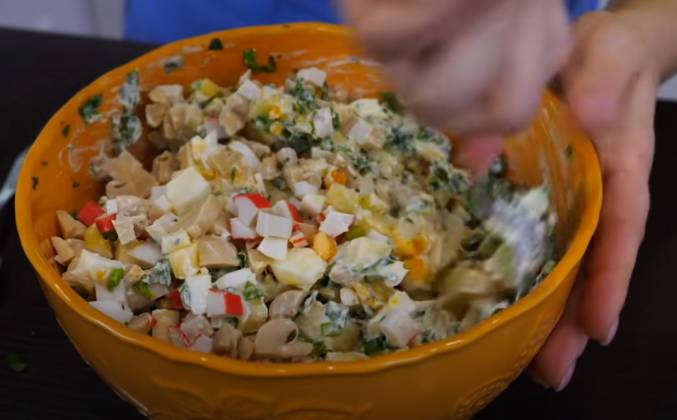 Как сделать Новый салат с крабовыми палочками, грибами, яблоками и яйцом рецепт Ольга Матвей.