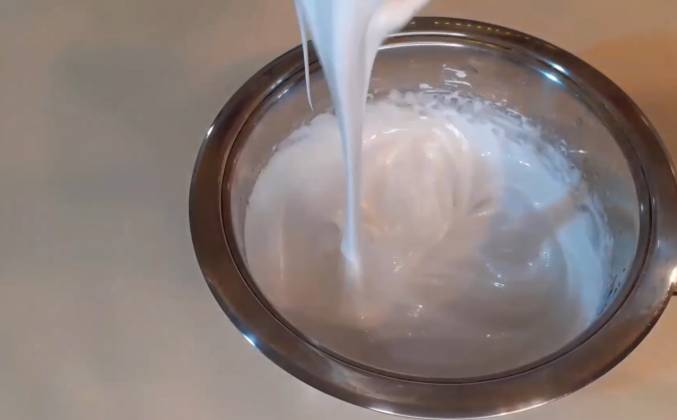 2. Затем снимаем ковшик с огня, даём охладиться, примерно минуту при комнатной температуре и бросаем желатин. Всё взбиваем миксером, на средних, затем как начинает всё густеть, на высоких оборотах миксера. Ну вот смотрите, уже наша глазурь становится белая, белоснежная, она становится более густая. Сейчас покажу консистенцию, какая примерно должна быть, вот. Хотите пожиже, чтобы стекала сильнее, делайте пожиже, я же обычно делаю вот такой густоты. Видите, она вот такими штуковинами стекает и и затем эту глазурь, наношу на кекс.