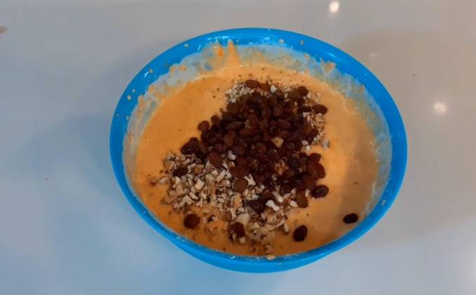 2. Затем вливаем яичную смесь, Всё перемешиваем лопаточкой, после того как влили. Долго вымешивать не нужно, слегка перемешали, добавили муку, затем добавили разрыхлитель и всё также недолго перемешали. Ну вот, мы всё перемешали, затем добавляем специи: имбирь, ванилин, мускатный орех, корица и кардамон. Затем добавляем цедру и всё перемешали, недолго миксером. Просто перемешали, до однородного состояния. Затем добавляем: орешки грецкие, изюм. Как только все ингредиенты мы добавили, всё перемешаем, осторожно лопаточкой, сверху вниз. Затем готовим форму 23 сантиметра, застеленной пергаментной бумагой. Выливаем туда тесто и убираем в духовку, разогретую до 170 градусов, примерно на 50 минут. Готовность теста, обязательно проверяем, деревянной шпажкой, потому что, ваша духовка, может отличаться.