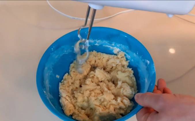 2. Как только всё взбил, вливаю половину взбитого яйца в сливочном-молочную смесь и всё перевешиваю венчиком, не долго, примерно 15-20 секунд. Всё перемешали, этого достаточно, затем в мучную смесь, вливаем жидкую смесь и всё примешиваем миксером, крючками до однородного состояния. Долго мешать не надо. Даже если, что-то слегка, мука где-то виднеется, это ничего страшного. И убираем в холодильник, примерно на 15-20 минут, до остывания. Тесто обязательно должно быть закрыто либо пакетом, либо силиконовым ковриком. Далее готовим стол, присыпаем его мукой и вымешиваем тесто, из холодильника. Друзья, сразу говорю, то что вымешивать долго не нужно, достаточно чтобы у нас, не крошились крошки какие то, чтобы у нас был, такой единый комок и всё. То есть, если она где-то, если мука где то просвечивается, это ничего страшного.