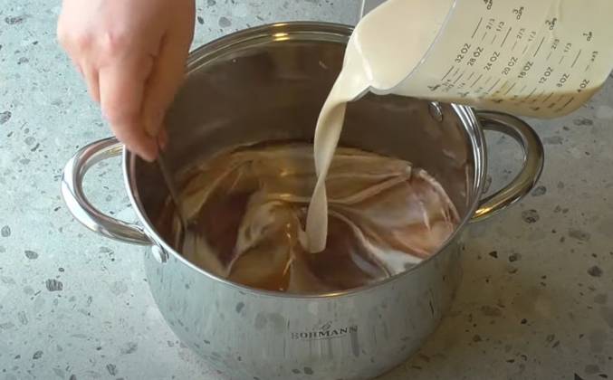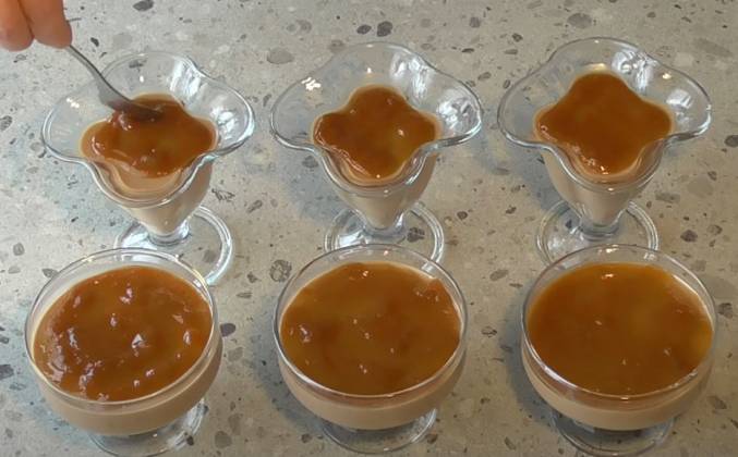 3. В дальнейшем десерт прекрасно держит форму и при комнатной температуре. Желе не очень сладкое, поэтому (конечно, если вы не считаете каждую калорию) покройте его поверхность карамелью. Она здесь очень уместна по вкусу. Я воспользовалась готовой карамелью. Но можно сделать самостоятельно: варёное сгущенное молоко разбавьте кипяченой водой до тягуче-льющегося состояния. Украсьте на свой вкус.Видео рецепт ютуб ниже 👇