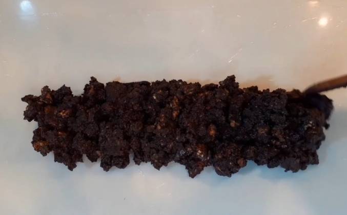 2. Я уже одел перчатки и начинаю разминать эту массу руками в перчатках. Посмотрите какая насыщенная, красивая масса получается. Уже на этом этапе, хочется мне скушать, но надо сдерживать себя и довести, этот рецепт, до своего логического завершения. Вот такая вот аппетитная, насыщенная шоколадная масса. Кстати этот рецепт, намного вкуснее чем, когда то продавалась шоколадная колбаса в Советском Союзе. Ну всё, убираю массу в холодильник, достаю пищевую плёнку и раскатываю её, по каменно столешнице. Если у вас просто обычный стол, вы зафиксируйте края пищевой плёнки: либо тарелками, либо стаканами. Далее шоколадную массу выкладываю вдоль пищевой плёнки деревянной ложкой и слегка её припечатываю. Друзья обязательно выкладывайте шоколадную массу, после того как она, постояла после замеса, примерно 10-15 минут в холодильнике. Очень большой плюс, этой пищевой плёнки в том, что когда мы формируем шоколадную колбасу, закрываем её, порционные кусочки, очень удобно брать, т.е. ваши пальцы (ваши руки) всегда будут чистые, без следов какао.