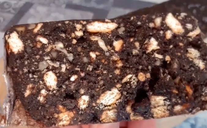 4. Благодаря тому, то что у шоколадного сервелата не скоропортящиеся продукты, он может находиться в морозильнике, даже неделю. Если вы его достанете и отрежете к чаю, он будет как свежий. Обратите внимание, на то что при нарезке, мои руки не касаются самого шоколадного сервелата, они касаются исключительно плёнки, то есть они всегда будут чистые, без следов какао. Именно поэтому, очень удобно пользоваться, когда шоколадный сервелат обёрнут в такую пищевую плёнку. Ну вот такой красивый шоколадный сервелат получился, видно даже прожилки от изюма, очень аппетитный, очень вкусный и ароматный.Видео рецепт ютуб ниже 👇