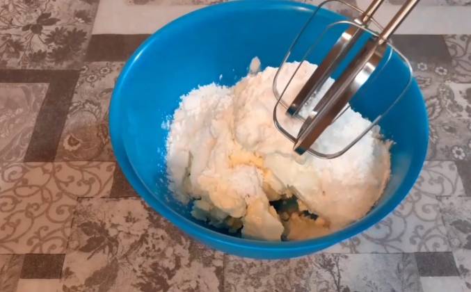 2. Вместо ликёра, либо какого-нибудь сиропа вы можете также использовать ванилин. Он сюда тоже, хорошо подойдёт. Вот творожную массу я смешал с сахарной пудрой. Не видно ни крупинок, ни следов сахарной пудры, всё однородно. Далее беру, холодные сливки и вливаю их в творожную массу.