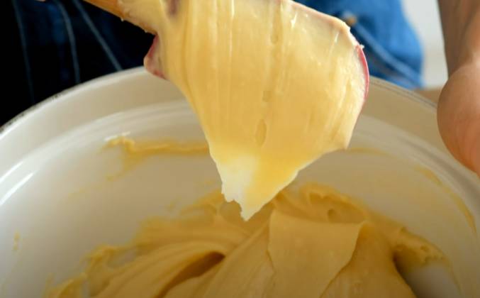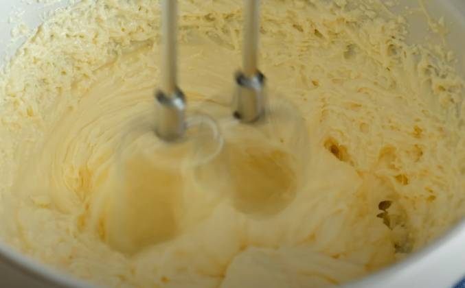 4. Если тесто пока не достигло обходимой консистенции, тогда добавьте еще одно яйцо. Выложите тесто в формы диаметром 18-20 см. Можно выпекать по очереди. А можно придумать из подручных средств вторую форму. Разровняйте тесто и выпекайте 20 минут при 200 С и еще 40 минут при 160 С. Продолжим приготовление крема: взбейте сливочное масло.