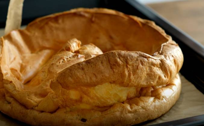 3. Приготовим заварное тесто: поставьте нагреваться в сотейнике молоко (140 гр), воду (60 гр), сливочное масло (90 гр), сахар (10 гр), щепотку соли и доведите до кипения. Затем добавьте муку (140 гр) и быстро перемешайте до образования на дне сотейника не большой корочки и гладкого теста. Выложите в миску тесто и перемешайте добавляя по 1 яйцу (4-5 шт). Добавив 4-е яйцо проверьте тесто. Оно должно плавно стекать с лопатки образовывая треугольник.