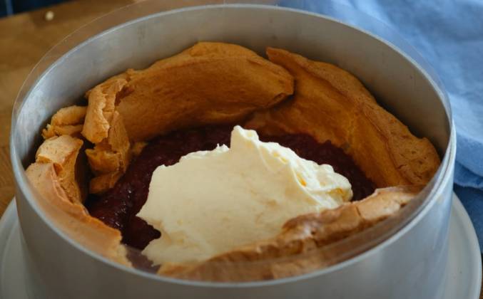 5. Затем продолжая взбивать добавляйте по 1 ложке заварную массу. Для удобства отсадки малиновое желе переложите его в кондитерский мешок. Соберите торт в кольце 18-20 см, застеленный ацетатной пленкой или пищевой бумагой. Накройте торт пленкой и поставьте в холодильник минимум на 4 часа. Украсьте торт.Видео рецепт ютуб ниже 👇