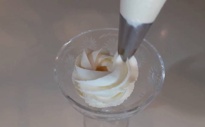 2. У меня на средних оборотах миксера, ушло 2 минуты примерно. Обязательно следите, как сбиваются сливки, посмотрите вот уже, вот такая масса должна получиться. Всё больше не взбивайте, это уже предельная масса. Если дальше взбить, то есть риск отсечения сливок. Наношу крем в креманку, посмотрите какая стабильная форма получилась. Этот крем подходит: для сборки тортов, украшения десертов и оформления пирожных. Вот такой крем получился.