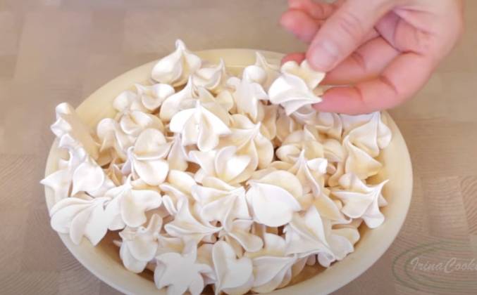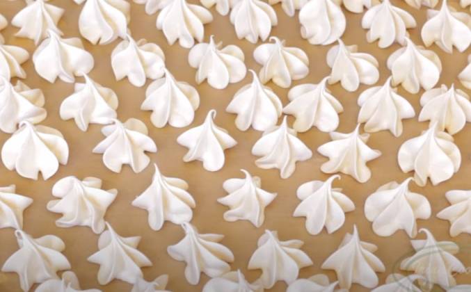 2. Снять миску с водяной бани и взбить яичные белки до устойчивых пиков. В конце добавить чайную ложку лимонного сока. Когда меренга готова добавить туда просеянную сахарную пудру с крахмалом, и вмешать на малых оборотах миксера. Включить духовку с конвекцией на 120°С градусов. Отсадите меренгу на пергамент или силиконовый коврик. Отправить противень в духовку на 1 час. Потом выключить и оставить до полного остывания.