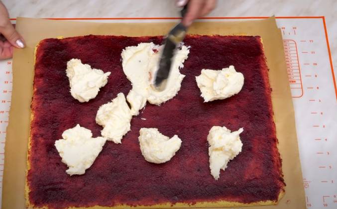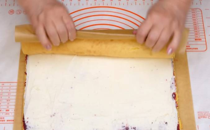 7. Совсем чуть-чуть крема отбираем для украшения рулета, но это не обязательно, а оставшийся выкладываем поверх вишневого джема и стараемся равномерно распределить его по всей поверхности. С одного края старайтесь крема оставлять поменьше, чтобы при сворачивании рулета, его не выдавливало. Слегка придерживая, аккуратно сворачиваем рулет, помогая себе бумагой. Оставляем его на этой же бумаге, укладываем швом вниз, чуть-чуть придавливаем, заворачиваем, чтобы он не заветрился, перекладываем на любую ровную поверхность и убираем в холодильник хотя бы на пару часов, а лучше на всю ночь.