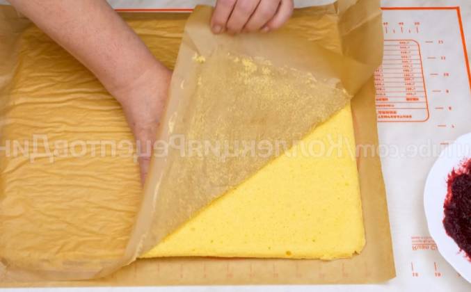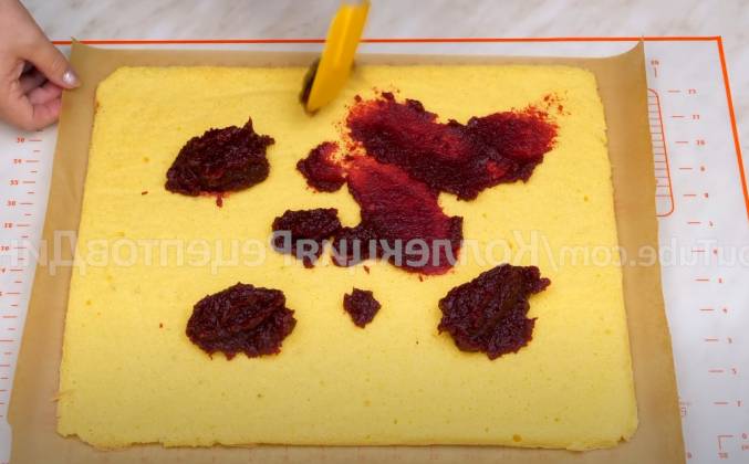 5. Он легко разминается вилкой или ложкой и так же прекрасно намазывается. Остывший бисквит накрываем листом бумаги, переворачиваем и снимаем ту, на которой он выпекался. Выкладываем на него джем и с помощью силиконовой лопатки равномерно распределяем по всей поверхности. Кроме того, из этого же джема можно сделать фруктовую желейную прослойку методом заливки так, как готовят их для тортов. В этот раз я не стала этого показывать, но, если вам интересно, напишите в комментариях и я сниму отдельное видео, как приготовить такую прослойку для тортов, бисквитных рулетов и других десертов.