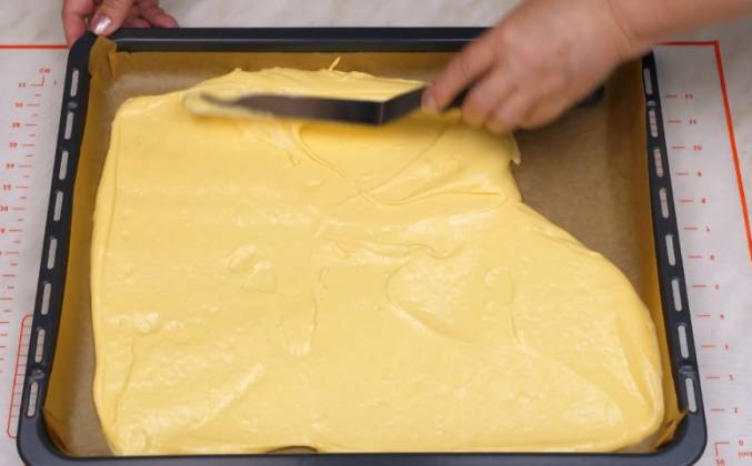 3. Этого количества теста как раз хватает на стандартный противень размером 30×40 см, который необходимо застелить силиконизированной бумагой для выпечки. Такой бумаге смазка не требуется, но, если у вас обычный пергамент, обязательно смажьте его мягким сливочным маслом, иначе вы не сможете снять бисквитный пласт. Распределяем тесто ровным слоем по всей поверхности, толщина намазки должна быть 5-7 мм. Сразу же отправляем противень в духовку и выпекаем бисквит на среднем уровне, без конвекции, на режиме верхний и нижний нагрев, при температуре 200-220°C в течение 10-15 минут. Конечно, духовки у всех разные, поэтому ориентируйтесь на внешний вид бисквита - он должен стать слегка золотистого цвета, а на ощупь пружинить и не липнуть к пальцам, тогда он полностью готов! Самое главное, его не пересушить, иначе он станет ломким, особенно края, и вы не сможете свернуть его в рулет.