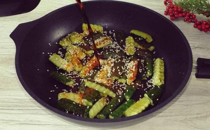 2. Надо чтобы они жарились, а не тушились, на это уйдёт минут 5. К обжаренным огурцам выдавить чеснок по вкусу. Добавить паприку и перец, по вкусу, если любите остренькое добавьте красного перца. Так же мне нравится добавлять кунжут и немного соевого соуса (ориентируйтесь по своему вкусу, не пересолите).
