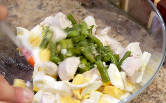 3. Готовую фасоль также можно переложить в салатницу прямо с соком, в котором она тушилась. Яйца сварились, и их необходимо залить холодной водой. Ну и в то же время у нас уже сварилась курочка, переложим ее на доску и дадим немного остыть. Курицу необходимо порезать на произвольные кусочки. Яйца остыли, и сейчас необходимо их почистить. Яйца также необходимо порезать на кусочки, сперва пополам, а потом, как получится. Перекладываем яйца в салатницу. Ну и по сути нам осталось все это хорошенько перемешать. Я не буду добавлять сюда дополнительно соли и перца, потому что мы уже солили курицу, ну, а также солили и перчили зеленую фасоль. Наш салат готов!Видео рецепт ютуб ниже 👇