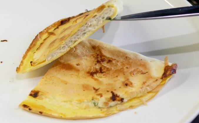 3. Первый чебурек готов. О, красотища! Сейчас сразу разрежу пополам, чтобы посмотреть, приготовилось ли мясо за 6 минут. Как видно, мясо все белое, а значит готово. Яичные чебуреки готовы! И весят они 660 г, на которые приходится примерно 90 г белка, 55 г жиров и 25 г углеводов, что составляет 955 килокалорий. На 100 г здесь приходится примерно 14 г белка, 8 г жиров и 4 г углеводов, что составляет 145 килокалорий. Самое время их попробовать. Очень удобное блюдо, потому что кусочек можно легко взять в руку. И поэтому его легко съесть дома или взять с собой на работу или учебу. По вкусу это действительно чем-то напоминает чебурек. Только он не такой жирный и не с такой зажаристой корочкой, как обычные чебуреки. Классное блюдо, очень универсальное. Его можно смело есть на завтрак, отличный вариант для перекуса. Ну и само собой на обед или ужин. Ну и к мясной начинке помимо зелени и лука можно добавлять абсолютно любые другие овощи. Например, чеснок, болгарский перец или все, что вам вздумается. Выглядят чебуреки шикарно, готовятся просто. И я думаю, такое блюдо может смело вписаться в рацион как и худеющего, так и тех, кто набирает массу.Видео рецепт ютуб ниже 👇