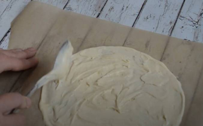 2. И сразу тонким слоем начинаем размазывать наше тесто по периметру круга, не выходя за края. Тонким, тонким слоем. Если по краю у нас больше теста мы разравниваем его к центру, чтобы наш корж был ровным. Отправляем Сразу в духовку примерно на 5-7 минут, до светло-золотистого цвета, как на видео . И в это время мы размазываем другие круги. Так поступаем пока наше тесто не закончится. Примерно 11 коржей у вас получится. Даем каждому коржу остыть. Потом только ставим их друг на друга, в противном случае они прилипнут друг к другу.