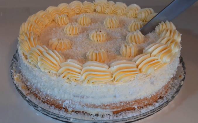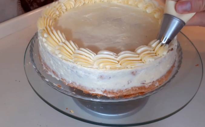 5. Если у вас нет в наличии, ни лопатки, ни шпателя, вы можете наносить крем, при помощи плоского, широкого ножа. Далее при помощи кондитерского мешка и насадки, я оформляю торт, виде таких узоров, также использую крем масло со сгущёнкой. Посмотрите, какие чёткие прорисовки узоров получаются. Масло со сгущёнкой, это конечно крем на любителя, но посмотрите какие чёткие, явные очертания. Обычно, советские торты, таким кремом и оформляли. Тогда не знали, что такое cream cheese и взбитые сливки. Для советских граждан, всегда такой торт, был праздником! Ну вот, решил обсыпать всё кокосовой стружкой.