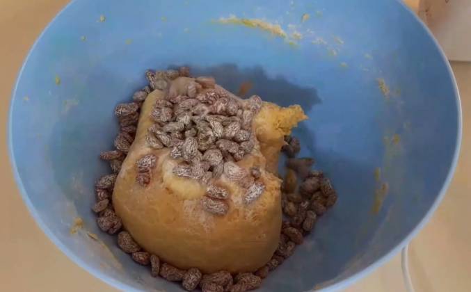 2. В масляную основу вливаю опару и всё перемешиваю миксером, примерно полминуты. Достаточно только перемешать. И как только смесь перемешал, всыпаю муку, тремя порциями. После каждого раза, перемешиваю хорошенько крючками, до однородного состояния, чтобы не было сухой муки. Муку я в мешал в тесто, затем добавляю изюм, всыпаю кардамон и всё перемешиваю крючками миксера, чтобы изюм хорошо вмешался в тесто. Руки промазал растительным маслом и хорошо вымешиваю тесто, примерно 2-3 минуты. Если тесто прилипает к рукам, добавьте больше растительного масла в свои руки и тесто, не будет прилипать. Вот такой комок получился. Затем накрываю полотенцем и убираю в тёплое место, примерно на 30-40 минут. После того, как тесто отстоялось, ещё раз промешиваю тщательно тесто.