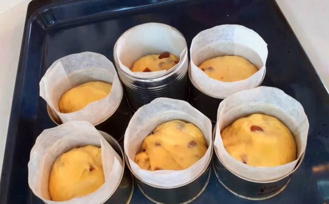 3. Формирую колбаску, затем эту колбаску разделяю на 2 половинки. Из каждой половинки, формирую по 3 комочка. В итоге у меня получилось 6 сдобных, круглых булочек. Куличи выпекаю в консервных банках. Дно банки застелено пергаментом, внутренняя часть стенки банки, также закрыта пергаментом. Консервные банки с тестом, я перекладываю на противень, закрываю полотенцем и убираю в тёплое место, на 20 минут. 20 минут прошло, тесто поднялось. Затем убираю в разогретую до 160 градусов духовку, на 40-45 минут. Вот такие мягкие, сдобные куличи получились. Внутри они совсем как булочки, такие же сдобные, такие же насыщенные. Приготовил нейтральную глазурь, друзья, это идеальная глазурь на куличи. Обязательно в конце видео, посмотрите, я дам ссылку.