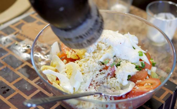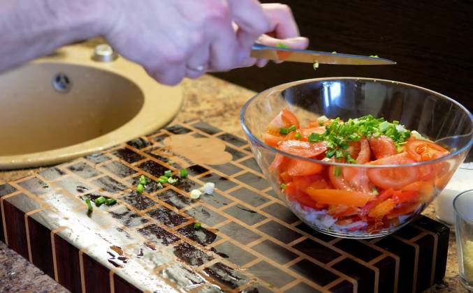 2. Помидор также отправляется в салатницу. Ну и пока не сварились яйца, у нас есть время, чтобы порезать в салат зеленый лук. Яйца отварились, заливаем их холодной водой и даем остыть. Яйца остыли. Я их почистил и сейчас точно также нарезаю их полукольцами. Нам осталось добавить в этот салат тертый сыр, заправку, немного соли и перца и хорошенько перемешать. Крабовый салат готов! Весит он 1000 г, на которые приходится примерно 40 г белка, 25 г жиров и 40 г углеводов, что составляет 545 килокалорий. На 100 г здесь приходится примерно 4 г белка, 2,5 г жиров и 4 г углеводов, что составляет 55 килокалорий. Самое время его попробовать.