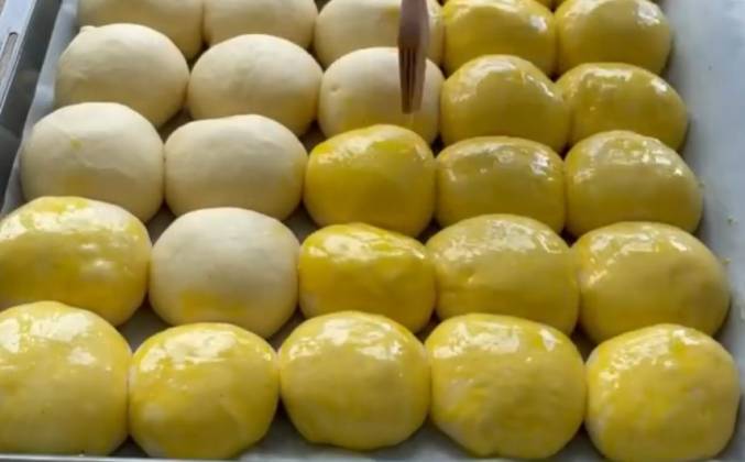 2. Далее, чашу смазываем раст маслом, кладём тесто, закрываем сначала плёнкой пищевой а потом кухонным полотенцем даём тесте подняться в тёплом месте. СКАТЫВАЕМ в шарики и кладём на противень застеленной пергаментной бумагой. Накрываем и даём подняться 15-20 мин. Далее, смазываем желтком.