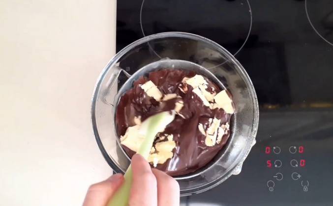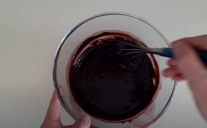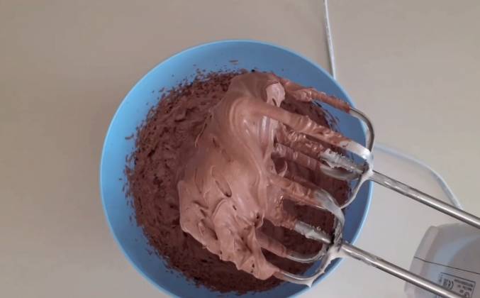 2. Шоколадную глазурь достал из холодильника, она комнатной температуры. Промешиваю ручным венчиком, чтобы образовавшиеся сгустки в результате охлаждения, вмешались в общую массу. Очень важно не остудить шоколадную глазурь до холодного состояния, иначе она просто однородно не вмешается из-за высокой плотности в холодном состоянии. Шоколадную глазурь взбиваю на высоких оборотах миксера, до шоколадного крема. Посмотрите какой пышный шоколадный крем (или точнее шоколадный ганаш) получился, он уже очень вкусный. Главное не убирать его в холодильник или он уплотнится, поэтому оставляю его при комнатной температуре. В охлаждённую творожную массу перекладываю, шоколадный ганаш. Сразу начинаю взбивать на высоких оборотах миксера, до однородного крема.