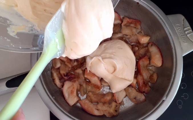3.  Перемешиваю недолго миксером на низких оборотах. Вливаю тесто в сковородку на карамелизованные яблоки. Распределяю тесто по всему периметру сковородки. Включаю низкий огонь и закрываю крышкой. Чтобы сориентироваться в температуре, у меня электрическая плита на 9 уровней, я выпекаю на 2 уровне, чтобы яблоки не сгорели. Выпекался пирог ровно 1 час, проверяю деревянной шпажкой. Внутри сухое, но на поверхности ещё влажное тесто. Силиконовой лопаткой, отделяю тесто от борта сковородки. Поверх сковородки устанавливаю удобную плоскость и переворачиваю сверху вниз. Вместо металлической помощницы, можно использовать, плоскую тарелку или доску. Рекомендую перед переворачиванием смазать плоскость, любым маслом, тогда влажное тесто, не прилипнет, как это случилось сейчас у меня из-за спешки. Оставляю допекаться пирог ещё 15 минут. До полной готовности. Пирог готов. 4.  Снимаю сковородку с плиты. Переворачиваю пирог на плоскость. Устанавливаю сервировочное блюдо для пирога и снова переворачиваю в исходное положение. Яблочный пирог готов! У него потрясающий аромат яблок и карамели с топлёным маслом. Это настолько вкусный и нежный пирог, что удержаться от такого лакомства практически невозможно. Когда я готовлю яблочный пирог на сковороде, соседи просто с ума сходят от запаха, исходящего из моей квартиры. Как только начинаю кушать яблочный пирог, рука автоматически тянется за новым кусочком, чтобы насладиться этим изысканным вкусом. Удивите своих близких и родных, приготовив яблочный пирог на сковородке. Вкус этого шедевра не оставит равнодушным никого, я это гарантирую. Рекомендую подавать яблочный пирог в карамели к горячему чаю.