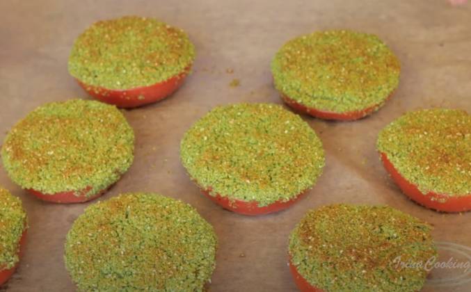 3.  И еще присыпьте сверху, чтобы получился такой хороший толстый слой. Отправляю помидоры в нагретую духовку примерно на 20 минут. Они должны подрумянится. Обязательно дайте им остыть хотя бы до теплого состояния. Я желаю вам приятного аппетита и очень рекомендую попробовать такие помидоры в панировке! Вы точно не пожалеете!Видео рецепт ютуб ниже 👇