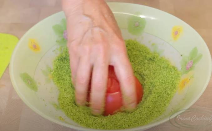 2.  Готовую панировку пересыпать в какую либо посуду. Возьмите хорошие крупные и вкусные помидоры. Их нужно вымыть, обсушить и удалить плодоножку. Разрезаем их вдоль пополам. Немного посолить, поперчить и чуть полить оливковым маслом. Дальше опускаю половинки помидоров в панировку и немного прокручиваю.