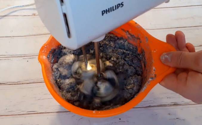 3.  Продолжаю вымешивать тесто на низких оборотах миксера. Не промешанную массу снимаю со стен чаши, силиконовой лопаткой. При помощи ручного венчика, осторожно вымешиваю тесто сверху вниз, до однородности. Вот такое шоколадное тесто с ярким шоколадным ароматом у меня получилось. На противень, выстеленный пекарской бумагой, выкладываю шоколадное тесто. Равномерно распределяю тесто, по всему листу при помощи силиконовой лопатки. При отсутствии силиконовой лопатки, можете воспользоваться любым плоским предметом или ложкой. Противень с тестом убираю в разогретую духовку до 160 градусов на 25 минут. Готовность выпечки проверяйте деревянной шпажкой, не вынимая лист из духовки. 4.  Для приготовления глазури, сотейник с шоколадом установи на слабый огонь, постоянно перемешивая, чтобы шоколад полностью растаял. В растопленный шоколад добавляю топлённое сливочное масло и всё перемешиваю до однородной глазури. Шоколадная глазурь готова. При помощи круглой выемки по печенью, вырезаю круглые шоколадные заготовки на пирожные. При отсутствии специальной формы, можете воспользоваться обыкновенным стаканом. Шоколадные обрезки перетираю руками в мелкую крошку. Готовые заготовки прорезаю острым ножом пилой, разделяя их на две половинки. Вместо ножа пилы, можете воспользоваться обыкновенным острым ножом. Каждую половинку заготовки прослаиваю сливовым джемом и скрепляю между собой.