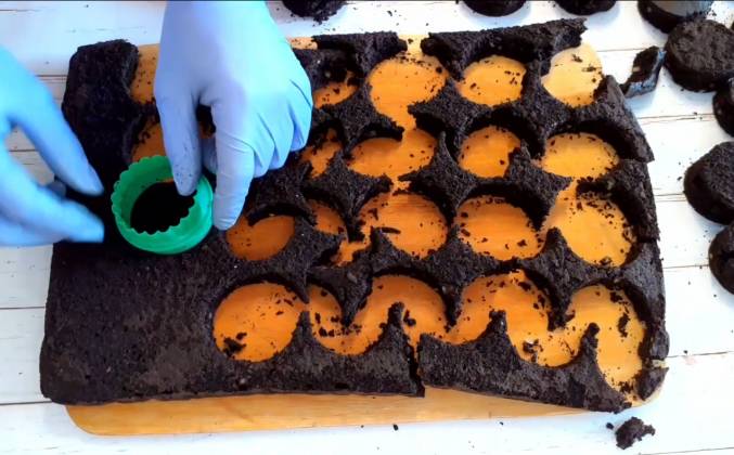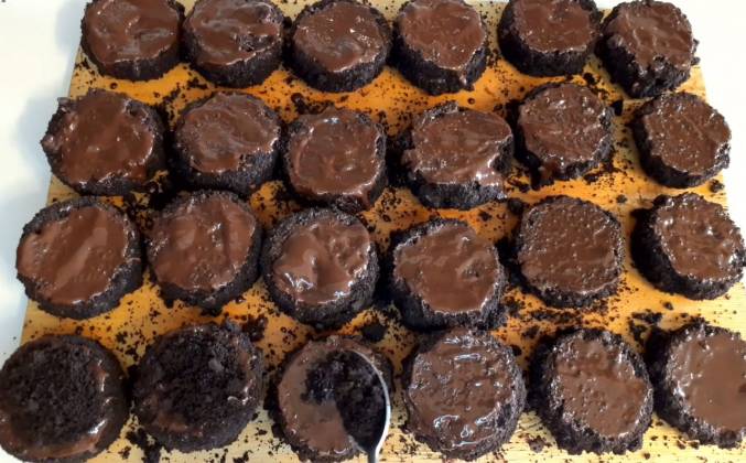 4.  Для приготовления глазури, сотейник с шоколадом установи на слабый огонь, постоянно перемешивая, чтобы шоколад полностью растаял. В растопленный шоколад добавляю топлённое сливочное масло и всё перемешиваю до однородной глазури. Шоколадная глазурь готова. При помощи круглой выемки по печенью, вырезаю круглые шоколадные заготовки на пирожные. При отсутствии специальной формы, можете воспользоваться обыкновенным стаканом. Шоколадные обрезки перетираю руками в мелкую крошку. Готовые заготовки прорезаю острым ножом пилой, разделяя их на две половинки. Вместо ножа пилы, можете воспользоваться обыкновенным острым ножом. Каждую половинку заготовки прослаиваю сливовым джемом и скрепляю между собой.  5.  Часть шоколадной глазури перелил в чашу. Глазирую шоколадную заготовку, обмакивая и прокручивая руками боковину в шоколадной глазури. Окунаю шоколадное пирожное в шоколадную крошку, обволакивая в шоколадной крошке. Оставшуюся шоколадную крошку рекомендую использовать для приготовления кейк попсов (cake pops) или пирожного картошка. Шоколадная крошка хорошо прилипла к шоколадному пирожному, благодаря нанесённой шоколадной глазури. На глазированные шоколадные пирожные с шоколадной крошкой сверху поливаю оставшуюся шоколадную глазурь. Распределяю шоколадную глазурь по всей поверхности каждого пирожного с помощью ножа. Сверху на шоколадные пирожные, порционно всыпаю, шоколадную крошку. Чайной ложкой разглаживаю поверхность пирожного, формируя небольшое углубление.