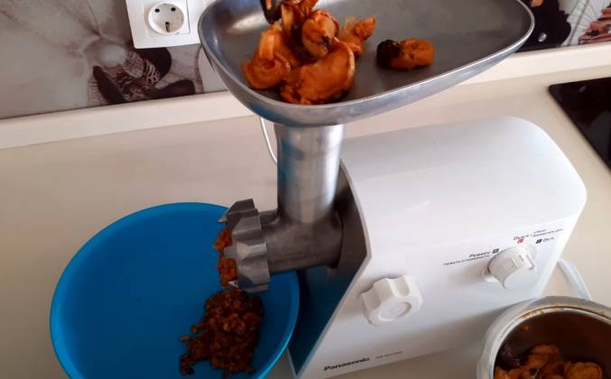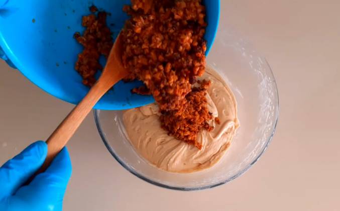 2. Перемешиваю миксером, не включая его, чтобы сухие ингредиенты не разлетелись в стороны и не забили мотор миксера. Затем включаю миксер на низкие обороты и недолго перемешиваю, до состояния однородного теста. На этом этапе тесто имеет приятную тягучую текстуру и чем-то напоминает по плотности заварное тесто. В медовое тесто выкладываю яблочно-грушёвую начинку. Перемешиваю деревянной лопаткой, чтобы начинка равномерно распределилась по всему медовому тесту.