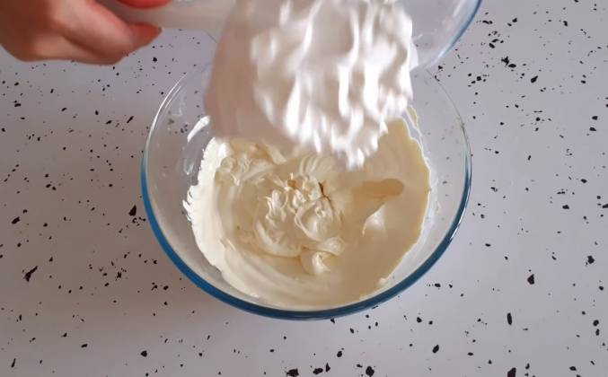 2. Меренга получилась пышная и устойчивая. Выкладываю всю меренгу в творожную массу. Осторожно перемешиваю ручным венчиком сверху вниз, чтобы все ингредиенты смешались. Вот такое творожное суфле получилось. В разъёмную форму диаметром 21 сантиметр, с выстеленной пекарской бумагой, выкладываю всё творожное суфле. Борта формы рекомендую смазать сливочным маслом, тогда процесс извлечения готовой запеканки, будет значительно проще. Поверхность суфле разглаживаю силиконовой лопаткой и несколько раз проворачиваю, для выравнивания. Убираю форму с творожным суфле в предварительно разогретую до 170 градусов духовку на 50 минут.