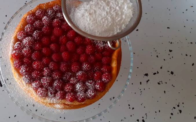 3. Остывшую творожную запеканку украсил спелой крупноплодной малиной. С помощью сита, обсыпаю малину сахарной пудрой, что придаёт очень аппетитный вид этому изделию. Вместо малины, можно использовать другие ягоды по вашему вкусу. Творожная запеканка с малиной из холодильника освежает и дарит массу положительных эмоций. Сочетание малины и нежного творожного суфле, это настолько гармоничное сочетание, что можно готовить хоть каждый день, особенно если в наличии есть свежие ягоды. Все кто пробует мою творожную запеканку, всегда просят добавки, настолько вкусный получается десерт из творога. Рекомендую подавать творожную запеканку с горячим чаем, кофе или компотом.Видео рецепт ютуб ниже 👇