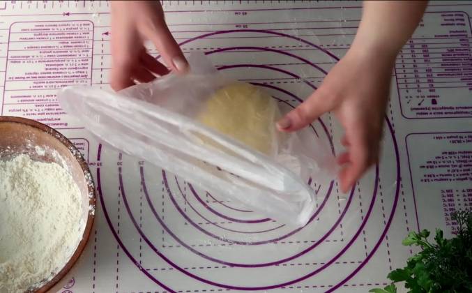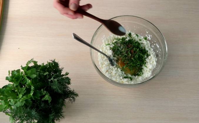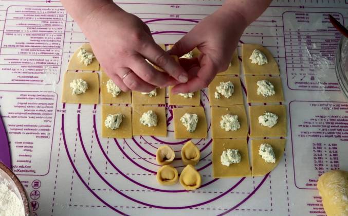 2. Перемешиваем до однородного состояния. Убираем в холодильник на 10 минут. Стол посыпаем мукой, обминаем тесто и делим на две части. Раскатываем тонкий прямоугольный пласт. Разрезаем на пятисантиметровые квадратики. В центрах каждого квадрата кладем сырную начинку, примерно по пол чайной ложки. Лепятся тортеллини сначала косыночки, а затем уголки соединяются. Получается вот такой бутончик. Так поступаем со всем тестом.