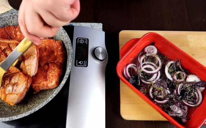 2. Трем ее друг о друга, чтобы соль и специи максимально обволакивали наше мясо со всех сторон. Какие-то специи вы можете заменить по вашему желанию, я настоятельно рекомендую использовать в этом рецепте имбирь и мускатный орех, они придадут божественный вкус вашей грудинке. Теперь выкладываем нашу грудинку шкуркой вниз на холодную сковородку и начинаем медленно ее нагревать. Нам нужно просто пришпарить немного нижнюю шкурку, чтобы из нее вытопился жирок. Пусть сковородка нагревается вместе с грудинкой. Пока наша грудинка обжаривается я нарежу лук кольцами толщиной в 3 - 4 миллиметра.