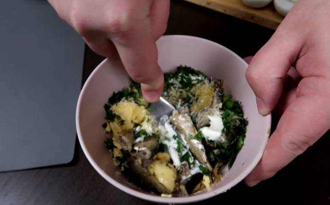 2. Для того, чтобы фаршировать яйца я разумеется каждое яйцо разрезаю напополам и удаляю из него желтки. Аккуратно вынимаю из них желтки. Для первой начинки мне понадобятся сами желтки, тертый сыр, порубленная зелень, шпроты, и майонез. Хорошенько все разминаем вилкой. Вот так! Перекладываю все это в кондитерский мешок с красивой насадкой и красиво отсаживаю в яйца