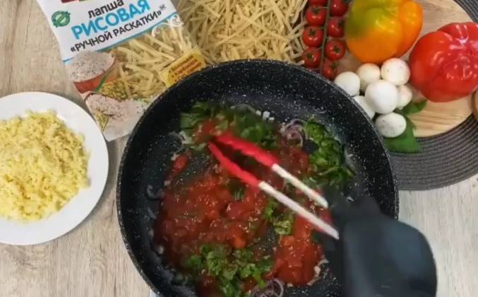 Как сделать Пасту из рисовой лапши с томатным соусом и базиликом рецепт простой.