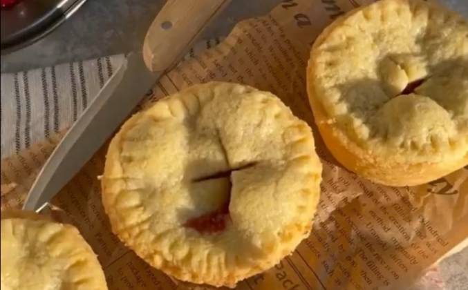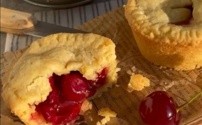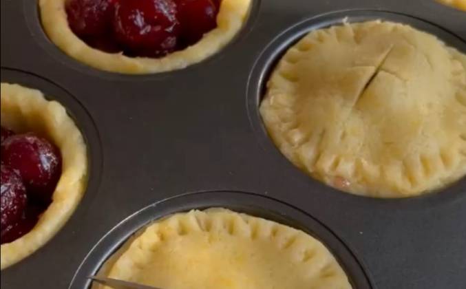 3. Для корзинок вырезаем 6 кругов d 9 см., аккуратно переносим в формы для кексов, я помогала силиконовый лопаткой, тк тесто очень нежное. Формочки можно немного смазать маслом. Наполняем вишневой начинкой. ⠀ Затем тесто собираем и можно раскатать ещё тоньше, для «крышечек», вырезаем круги d 6 см. Накладываем их на будущие корзиночки, можно немного растянуть руками, чтобы края теста сошлись.
